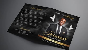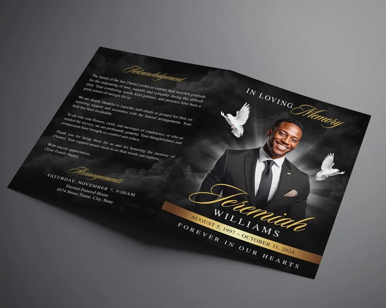 Create a heartfelt and dignified tribute for your cherished one with our funeral program. Crafted to provide solace and support during challenging times, this program offers a beautiful and structured approach to commemorate their life. It streamlines the planning journey, enabling you to devote time to treasuring special memories with family and friends. Simple to personalize and print, our program guarantees that you can honor your loved one’s legacy with elegance and respect.